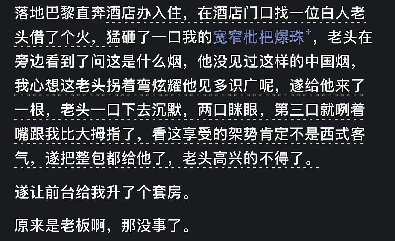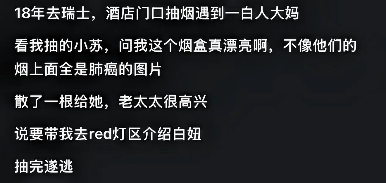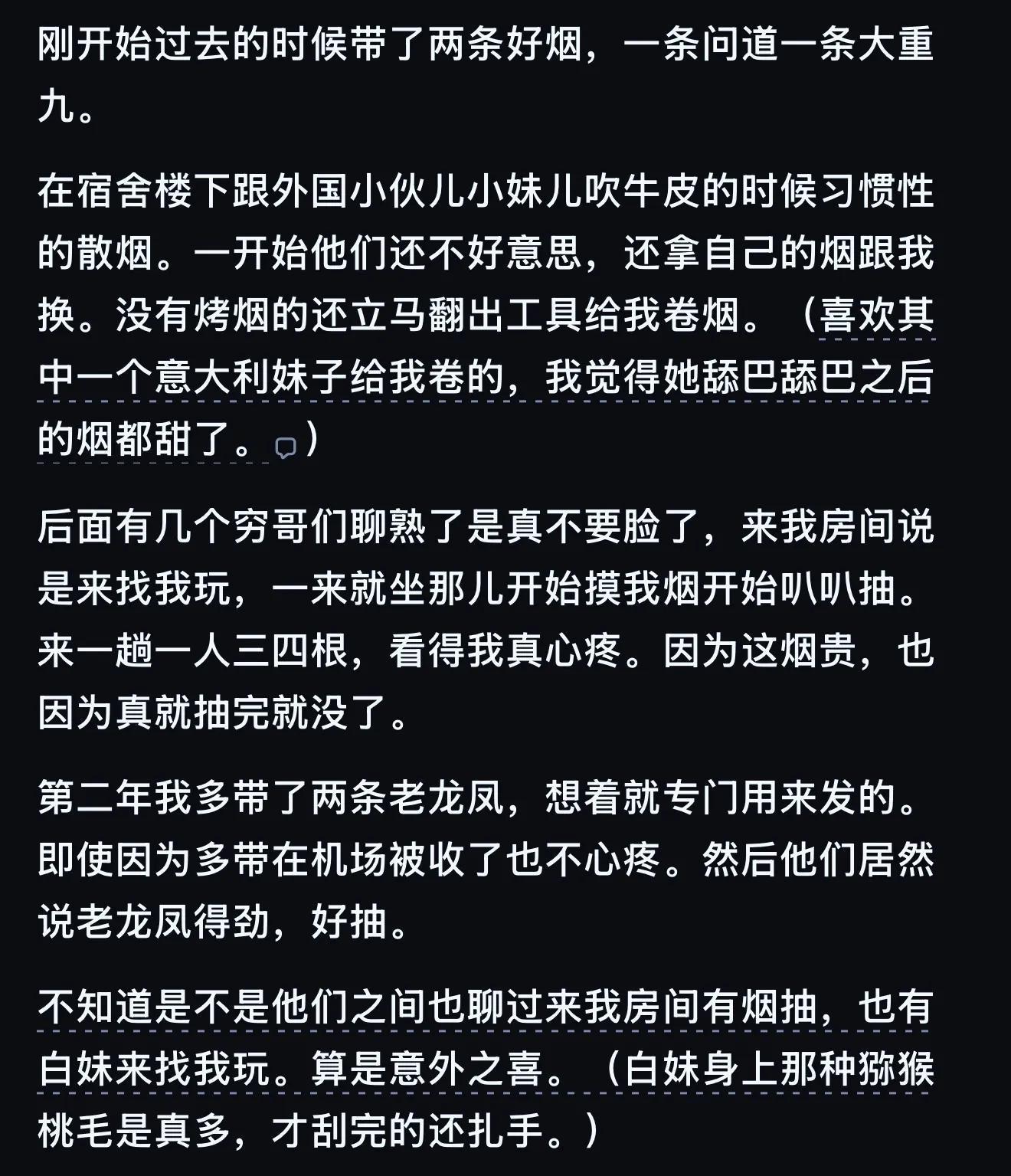 没主动发过,但被要过两次。一次在美国转灰狗的间隙,便利店门口吸烟点抽烟:被个小黑要了一支。跟大部分小黑不同,没什么口音,谈吐也很礼貌。第二次是在奥克兰机场,30左右的白女问我要烟,我说“10 dollars",她愣了一下,然后说"no money, butyou can pat my butt."警察同志,就是这么个情况,是她让我拍的不按套路出牌为啥我抽这...